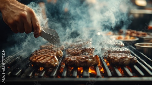 grilling, steak, bar-b-q, meat, food, cooking, hot, flames, smoke, grill, closeup, hand, tongs, preparation, eatery, kitchen, delicious, tasty, appetising, cookery, dish, protein, heat, spice, seasoning, fresh, brown, cooked, plate, favor