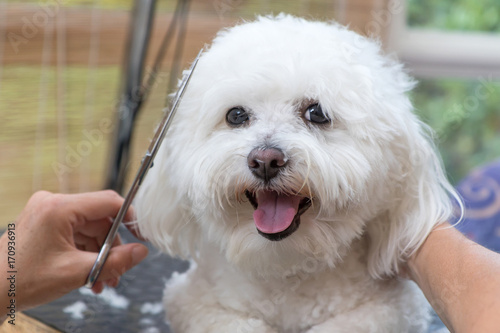 animal, grooming, cute, dog, table, pet, beauty, white, hair, breed, fur, canino, mammal, pedigree, domestic, purebred, head, portrait, doggy, adorable, background, looking, scissors, haircut, indoor, pedigreed, care, young, terrier, small, little, hygiene, tool, furry, closeup, profession, occupation, equipment, body, curly, frizzy, hand, smile