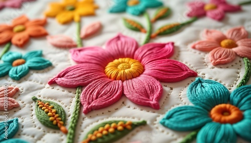 Close-up view of intricate stitched floral design on light-colored quilt square. Vibrant colors, detailed embroidery create beautiful flowers. Hand-stitched art piece. Beautiful patterns, vibrant