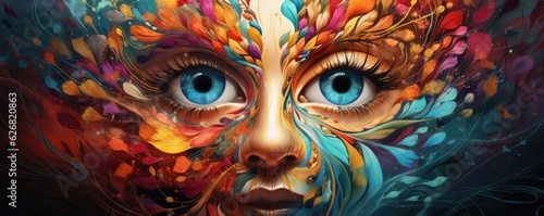 Close-up view of multi colorful human eye, panorama. Generative Ai.