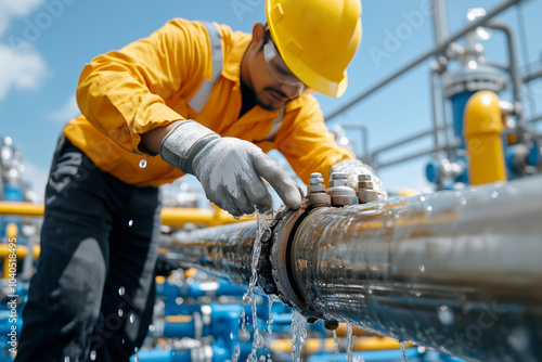 oil, pipeline, leak, maintenance, men at work, inspection, oilfield, repair, industry, machinery, environmental, contamination, safety, labor, equipment, infrastructure, crude oil, resource, operation, sunset, industrial, engineering, flow, liquid, construction, yellow, helmet, glove, teamwork, exploration, monitoring, performance, compliance, hazardous, prevention, energy, risk, pollution, technology, efficiency