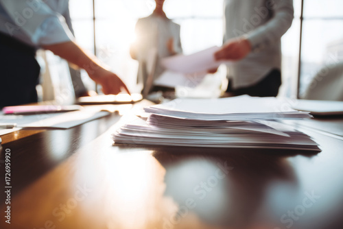 Close-up view of stacked documents and papers on a conference table as business colleagues discuss reports and exchange printed materials, warm sunlight and shallow depth of field suggest focus.
