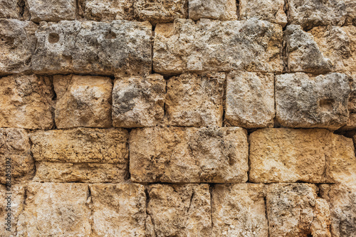 Closeup view of textured weathered ancient stone wall. Historical remains of times of Roman empire. Horizontal color photography.