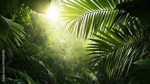 Close-up view of tropical palm trees with sunlight streaming through the leaves