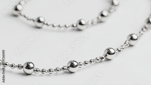silver, necklace, bead, jewellery, chain, design, fashion, accessory, metal, round, ball, detail, closeup, texture, polished, minimalist, modern, elegant, style, luxury, hand-made, craftsmanship, sparkling, glamourous, beautiful, simple, beading