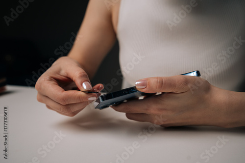 Close-up view of woman removing damaged tempered glass screen protector from smartphone with fingers, sitting at white table. Concept of mobile phone maintenance and service.