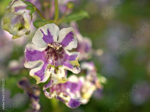 Closeup white purple petals of Narrowleaf angelon ,willowleaf angelon flower plants in garden with blurred background ,macro image , soft focus ,sweet color for card design