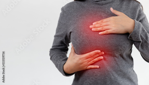 Close-up Woman hand touching her breast screening by self. female checks lump in her breast with her fist to investigate for breast cancer herself. Have chest pain.