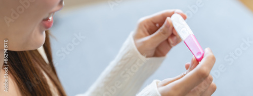 Close-up young woman checking on the pregnancy test and the result is positive.