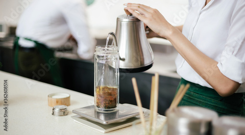Close-up. young woman pouring hot water into a glass to make herbal tea