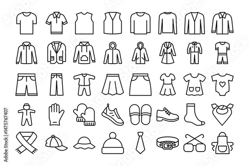 icon, fashion, clothes, apparel, wear, garment, shirt, symbol, set, sweater, casual attire, textile, dress, jacket, clean, style, vector, cap, sweatshirt, belt, sunglasses, stroke, editable, skirt, store, line, clothes, clothing, hat, coat, outline, man, woman, jumper, design, isolated, web, signs, illustration, flat, pictogram, activewear, sport, collection, hoodie, female, glove, male