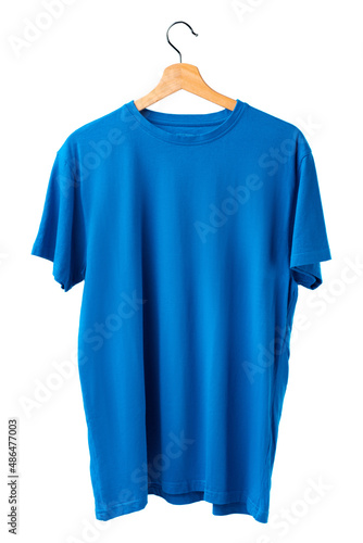Clothes hang on clothing rack over white background.
