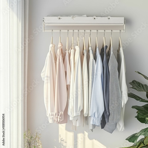 white, wall, hanger, shirt, clothes, closet, interior, home, decor, design, style, modern, minimalist, simple, elegant, fashion, laundry, clean, tidy, organised, room, window, light, shadow, plant, leaf, greenery, natural, bright, fresh