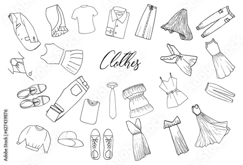 Clothes vector set ink linear illustration. Dress, skirt, pants, shirt, t-shirt, etc