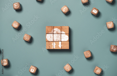 Cloud computing and technology icons print on wooden cube bock , cloud technology is centralise collect lifestyle and confidential information such as internet banking , password and shopping.