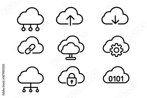 cloud, computing, icon, set, network, technology, datum, storage, server, security, database, upload, download, hosting, connection, web, cyberspace, outline, symbol, vector, pictogram, line, interface, transfer, digital, link, lock, binary, code, setting, cog, system, service, information, share, backup, app, simple, graphic