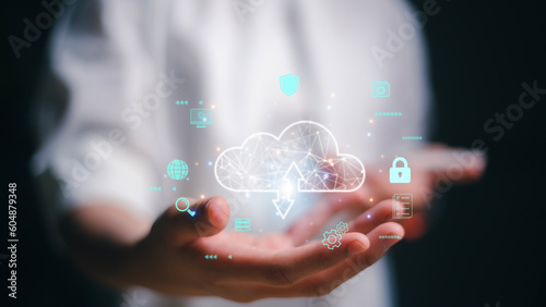 Cloud Computing Technology Internet Storage Network Concept, women hands holding virtual icon cloud
