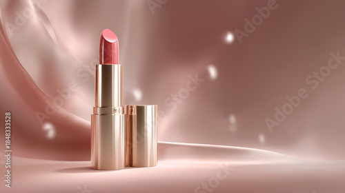 Cloud Dancer Glamorous Pink Lipstick in Gold Casing on Wavy Background with Light Orbs. Colour of the Year 2026