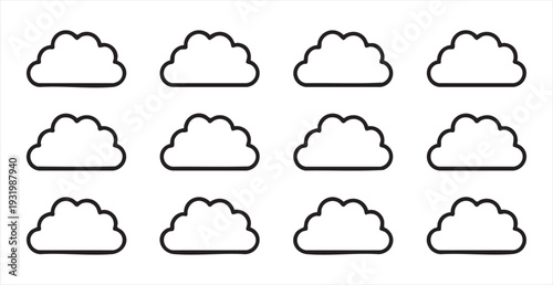 Cloud icon set with outline, twelve similar shapes of clouds on white background for design