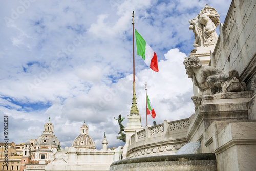 roma, sky, cloud, overcast, weather, historical building, landmark, city, center, altar, nation, dome, cupola, church, sculpture, statue, architecture, art, artistic, italian, italy, tour tourism, europa, white, marble, structure, stone, building, blue, fountain, flag, symbol, frieze, relief, urban, history, travel, water, angel, column, red, green, classical