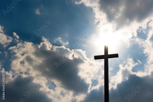 clouds parting and sunlight creating a natural spotlight on a cross