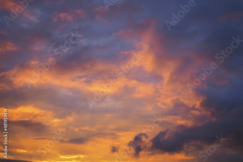 Cloudy sky at sunset. Dark violet and yellow natural background or wallpaper. The rays of the setting sun effectively illuminate the clouds. Beautiful and spectacular evening skies