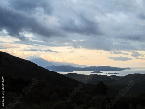 Cloudy view from the mountains in Gocek, Turkey - beach town of Fethiye below