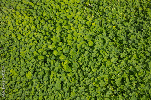 Clovers, trefoil, shamrocks, fresh flora. Green nature background