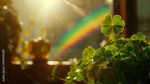 Clovers with a rainbow and soft background. St. Patrick's Day Concept.