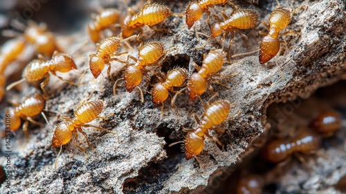 Cluster of small, orange termites crawling on decaying wood surface, macro closeup