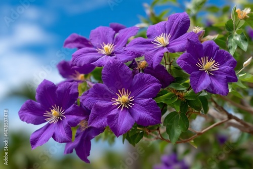 flower, purple, nature, blooming, plant, garden, clematis, flora, high-coloured, beauty, spring, summer, detail, closeup, macro, vibrant, colours, blossom, foliage, green, sky, cloud, daylight, photo, landscape, floral, bloom, tropical, decoration