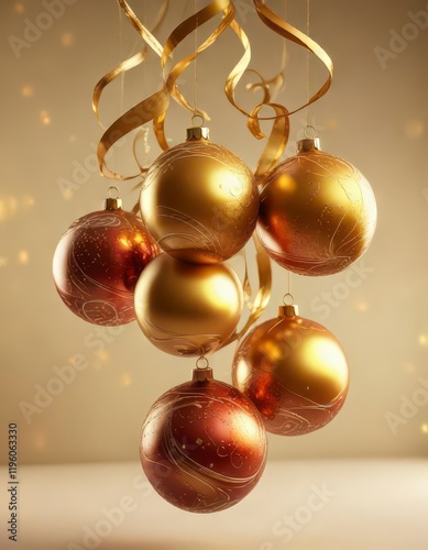 Cluster of vibrant, swirling abstract Christmas balls suspended in a warm golden light, glowing spheres, swirling, iridescent