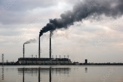 Coal power plant high pipes with black smoke moving upwards polluting atmosphere with reflections of it in lake water.