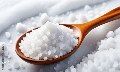 Coarse salt in wooden spoon on white background with crystal texture and natural culinary scene