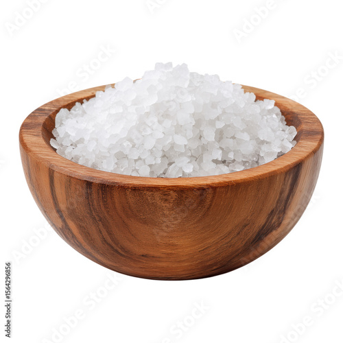 Coarse sea salt crystals heap in a rustic wooden bowl on a clean isolated on white transparent background PNG