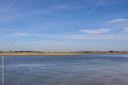 coastal bay landscape with pellicans in background and people enjoying leisure activities