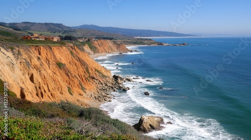 coast, ocean, cliff, wave, beach, sand, sea, sky, blue, water, home, house, building, landscape, view, scenic, california, pacific, nature, outdoors, environment, dramatic, rocky, shore, sunlight, daytime, horizon, mountain, hill, vegetation, greenery, plant, red, orange, erosion, tranquil, serenity, picturesque, breathtaking, beautiful, stunning