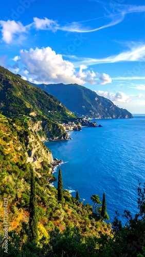 coast, sea, ocean, hill, mountain, road, tree, sky, cloud, blue, green, sun, landscape, scenic, nature, travel, mediterranean, picturesque, cliff, vegetation