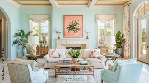 living room, interior, design, coastal, decor, home, elegant, serene, room, house, style, airy, light, pastel, furniture, sofa, chair, lamp, table, window, curtain, artwork, plant, floral, painting, light blue, beige, cream, white, comfortable, relaxing, peaceful, sophisticated, stylish, modern, classic, natural, bright, sunlight, roomy