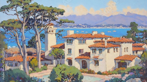 luxury home, coastal, ocean, view, scenic, hillside, painting, landscape, tranquil, home, decor, house, villa, mediterranean, architecture, california, real estate, property, luxury, coast, beach, summer, vacation, travel, holiday, serenity, peace, calm, beauty, nature, art, artwork, illustration, picturesque, idylli, paradise, waterfront, estate, residence, dwelling, building, home decor, poster, print, card