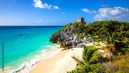 Coastal Mayan ruin with turquoise sea