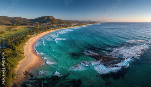beach, ocean, coast, wave, turquoise, sunrise, aerial, panorama, gold, sand, water, rock, cliff, hill, mountain, nature, landscape, scenic, view, travel, vacation, summer, holiday, stunning, beauty, tranquil, serene, vista, drone, photo, pacific, australia, coastal, palm, tree, green, grass, sunlit, calm, clear, horizon, wide, extensive, picturesque, amazing, beautiful, idylli