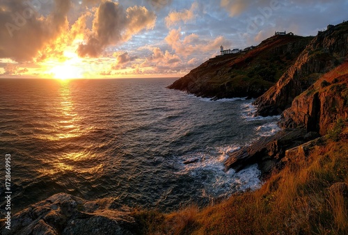 Coastal Sunset and Lighthouse - Golden Natural Landscape by Cliff