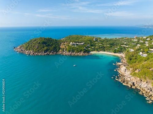 tropical, island, aerial view, coastline, turquoise water, greenery, beach, sky, ocean, nature, landscape, vacation, travel, summer, leisure, adventure, boating, relaxation, serenity, paradise, rock, sand, hill, wilderness, resort, beauty, get-away, escape, horizon, scenery, blue, wildlife, marin, calmness, explore, environment, sunshine, seascape, allure, destination, peaceful, crystal-clear