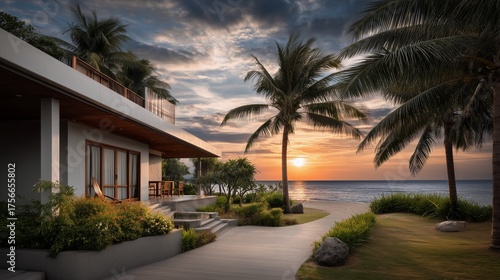 villa, palm tree, ocean, sunset, tropical beach, holiday home, tropical paradise, travel, architecture, building, house, coast, beach, sky, tree, plant, nature, horizon, water, sand, scenic, view, exterior, landscape, summer, peaceful, tranquil, holiday, resort, destination, elegant, stylish, modern, design, get-away, recreation, exotic, serenity, comfort, relaxation, leisure, paradise