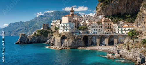 Coastal village nestled in a dramatic cliffside landscape. Bright azure water laps at the rocky shore, supporting buildings clinging to the hillside