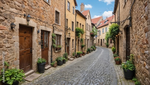cobbled, street, alleyway, village, town, europa, mediaeval, historic, architecture, building, house, window, door, stone, wall, facades, roof, sky, cloud, plant, flower, pot, street light, travel, tour tourism, destination, vacation, picturesque, charming, romantic, traditional, authentic, heritage, culture, history, urban, landscape, daytime, summer, bright, colourful, scenic, photograph, photo, image