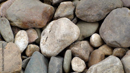 Cobblestones close up. Coarse gravel on the road. Gray stones of various sizes for construction.
