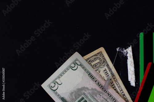 Cocaine lines, syringe needle and dollar banknotes on black background