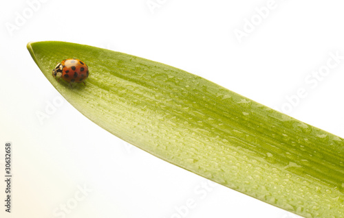 coccinella su foglia con rugiada